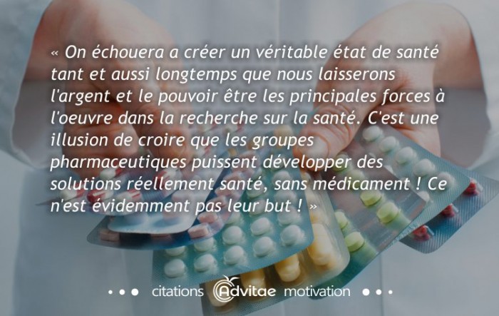 « On échouera a créer un véritable état de santé tant et aussi longtemps que nous laisserons l'argent et le pouvoir être les principales forces à l'oeuvre dans la recherche sur la santé. C'est une illusion de croire que les groupes pharmaceutiques puissent développer des solutions réellement santé, sans médicament ! Ce n'est évidemment pas leur but ! »