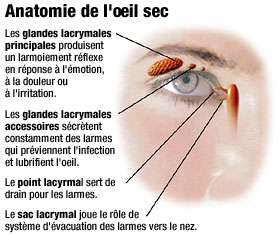 Il suffit qu'une de ces glandes ne fonctionne pas correctement, du fait d'une inflammation, d'une mauvaise irrigation sanguine ou d'une stimulation nerveuse déficiente, pour que le film lacrymal s'amincisse ou que sa composition s'altère, entraînant ce qu'on appelle le syndrome de l'oeil sec. Par ailleurs, ce syndrome peut se produire si les paupières ne se ferment pas complètement durant le sommeil ou au clignement des yeux. Le patient présentant le syndrome de l'oeil sec a des sensations désagréables et le médecin qui l'examine constate la présence de cellules mortes ou sèches à la surface de l'oeil, accompagnées d'un rougissement des paupières et de la formation de croûtes.